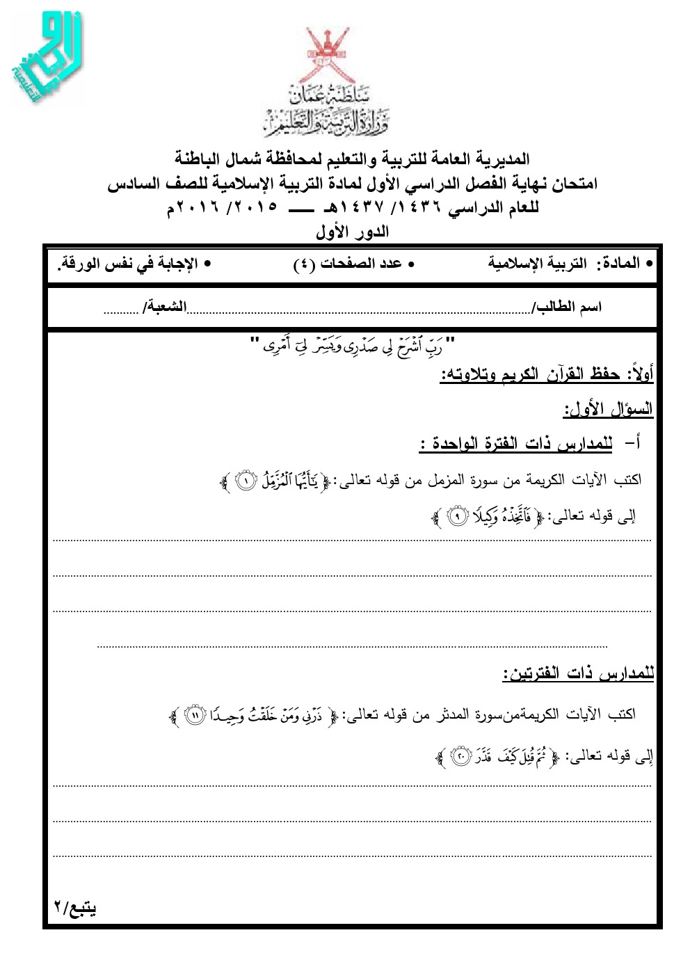 الدور الأول امتحان واجابة الدور الأول 2016 2015م شمال الباطنة الصف السادس رياضيات الفصل الأول 2018 2019 المناهج الإماراتية