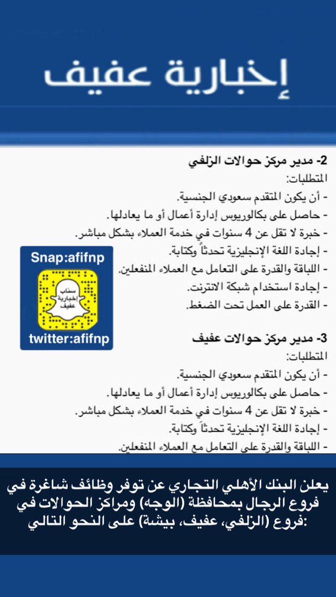 إخبارية عفيف On Twitter يعلن البنك الأهلي التجاري عن توفر وظائف شاغرة في فروع الرجال بمحافظة الوجه ومراكز الحوالات في فروع الزلفي عفيف بيشة على النحو التالي إخبارية عفيف عفيف Https T Co 0csgrb7tjo