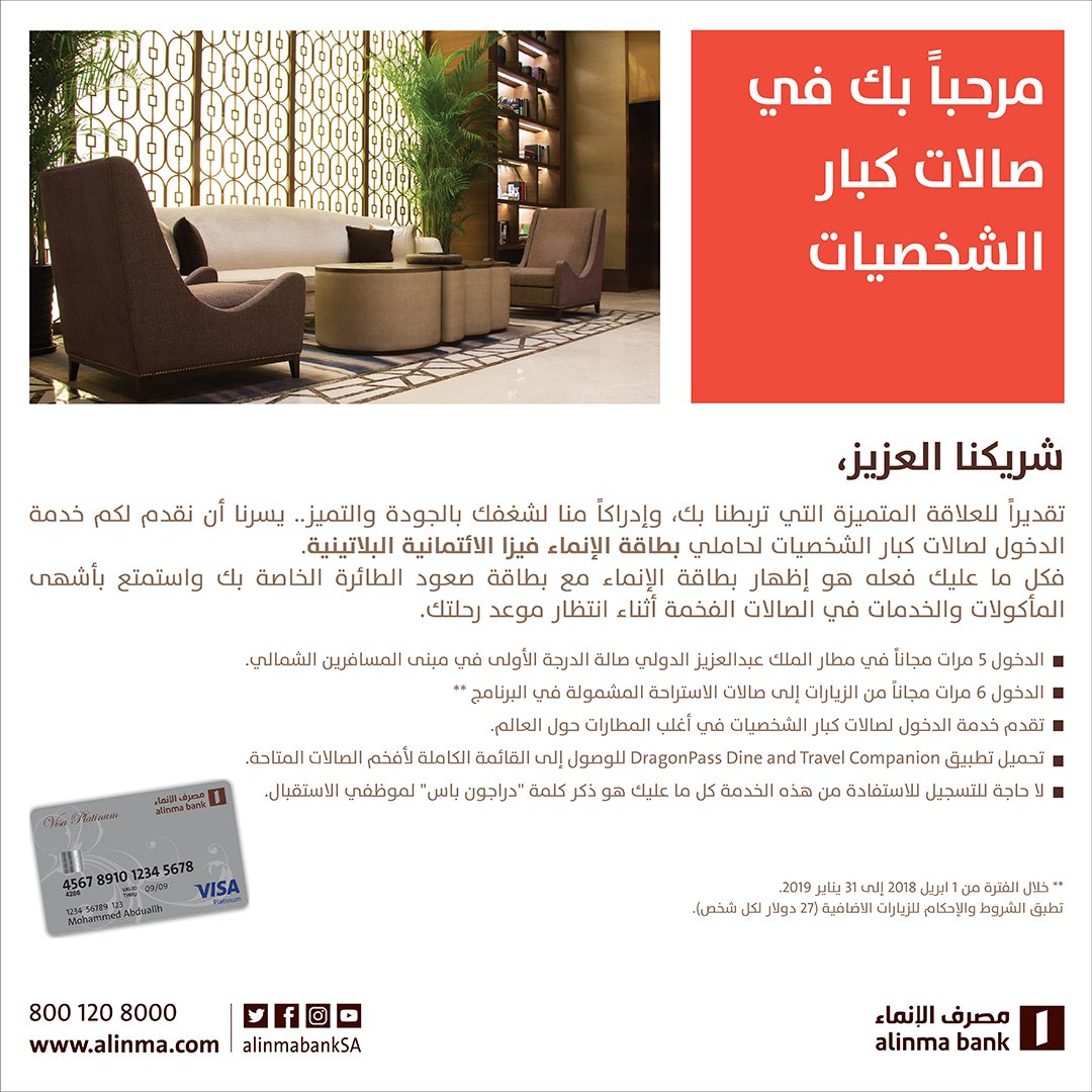 مصرف الإنماء On Twitter تمتع بخدمة الدخول لصالات كبار الشخصيات في المطارات حول العالم لحاملي بطاقة الإنماء فيزا الائتمانية البلاتينية Https T Co H2rwuljs9v Https T Co W66vzjrdkz